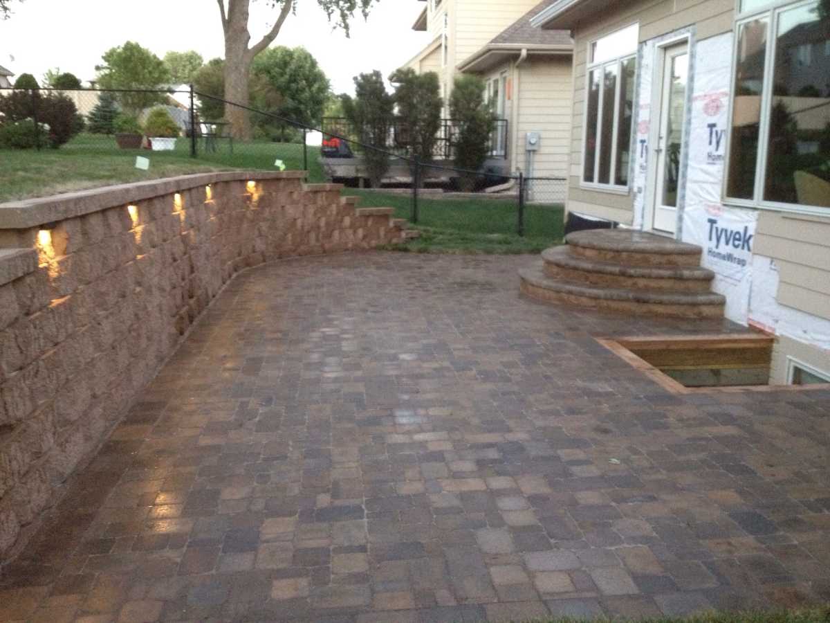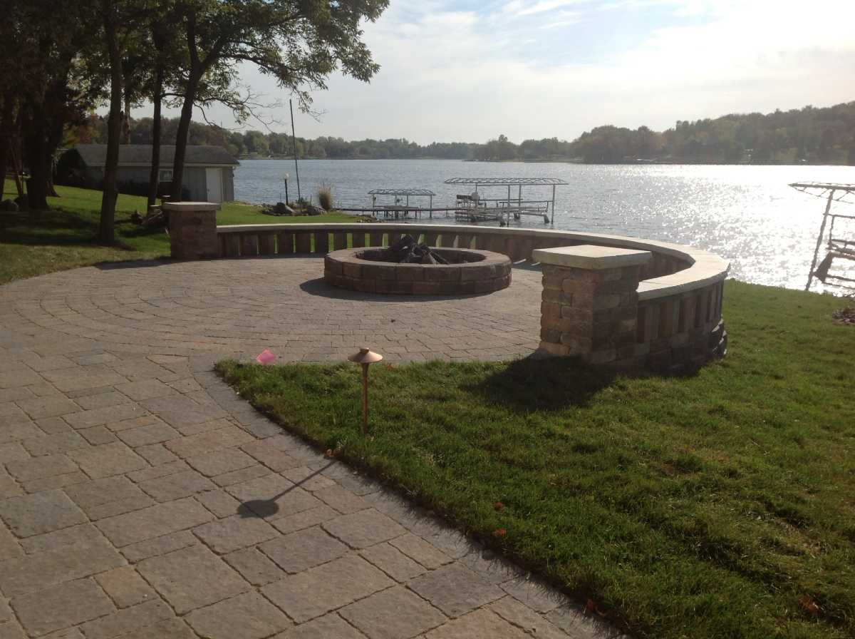 Custom patio and fire pit with a seating wall near Waukee, IA.